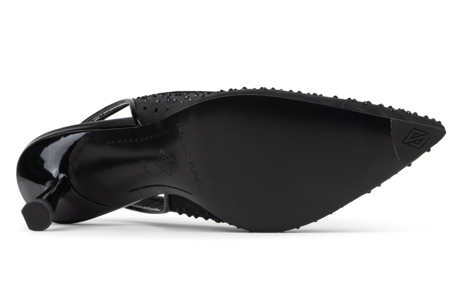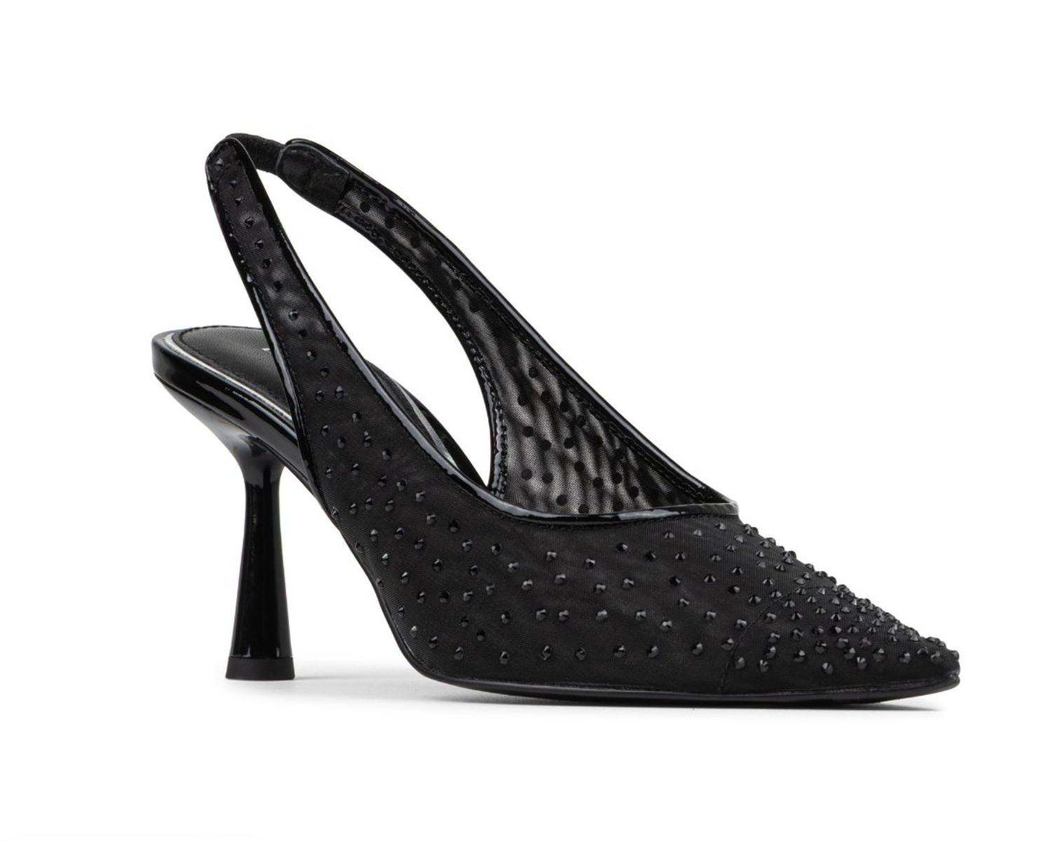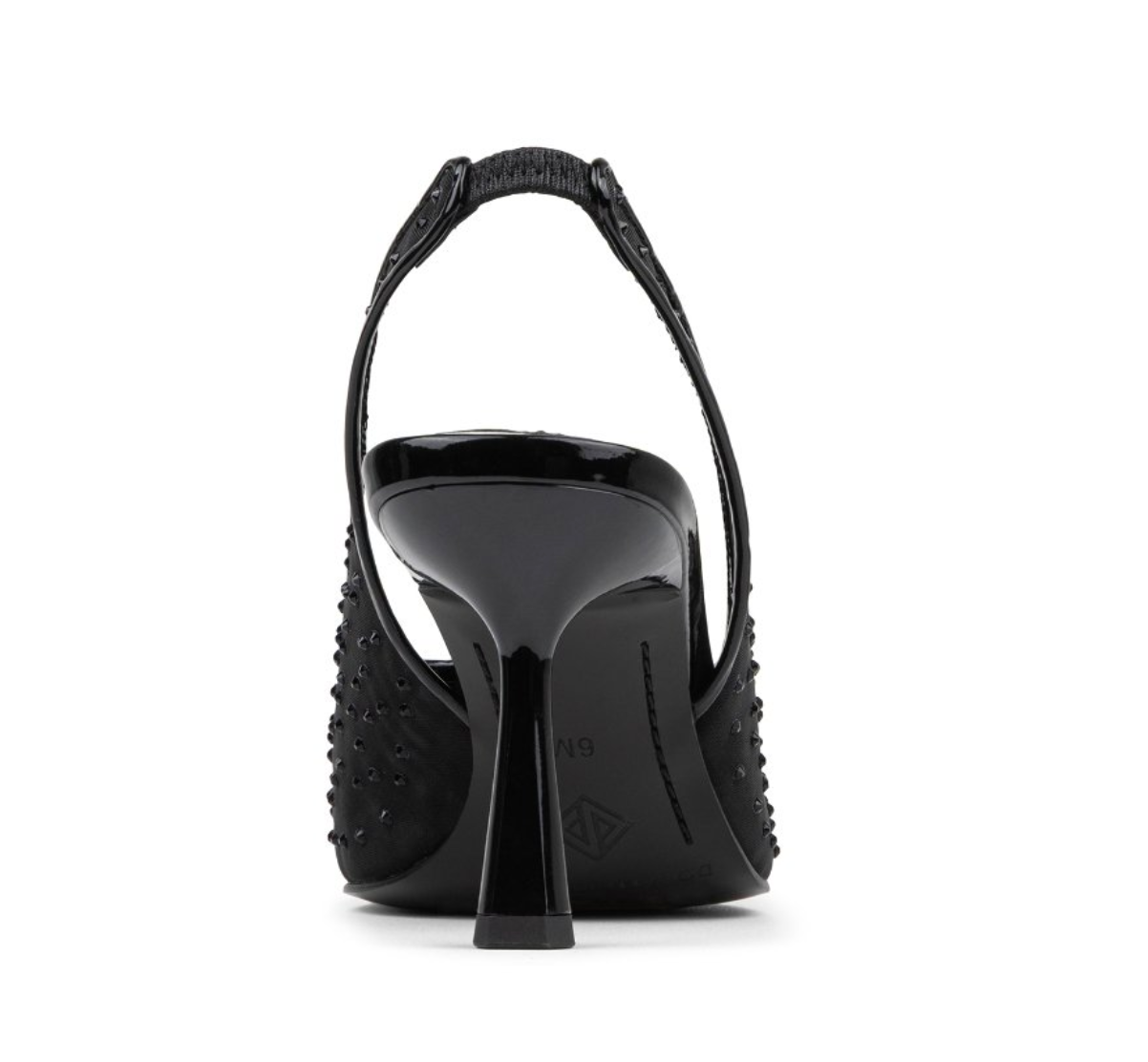 The Donald Pliner Women's Eloise in Black Mesh blends sophistication and comfort seamlessly. Featuring a sheer mesh upper adorned with delicate crystal studs and refined piping, this pointed-toe slingback makes a striking statement. The elastic heel strap guarantees a secure, comfortable fit, while the slim sculpted heel adds a polished touch of shine, perfect for elevating any outfit with effortless grace.